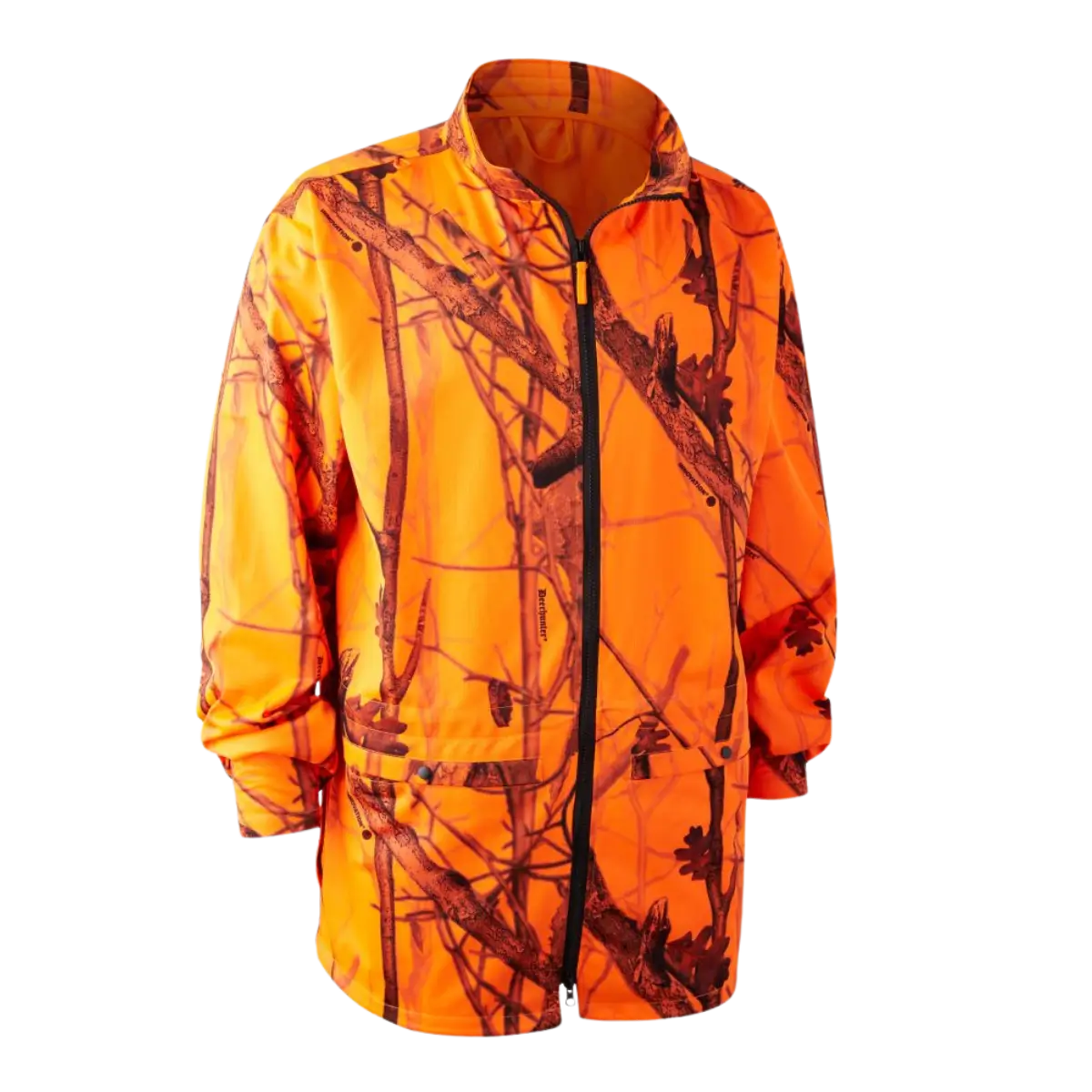 Praktische Überziehjacke mit camo-orange für Sichtbarkeit; verstellbarer Kragen, Bund und Manschetten; Funkgerätöffnungen und Seitentaschen; Material 100% Polyester.